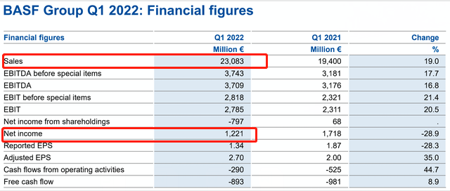 2022年一季度,巴斯夫实现营业收入230.83亿欧元,同比增长19%;净利润12.21亿欧元,同比下滑28.9%。