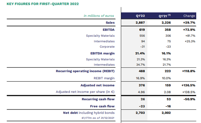 尽管原材料和能源成本高涨,但阿科玛在第一季度仍取得了出色的业绩表现。2022年一季度阿科玛实现营业收入28.87亿欧元,同比增长29.7%;调整后净利润为3.76亿欧元,同比增长136.5%。