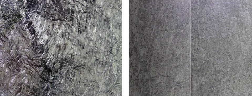 纤维在碳纤维SMC中的遍布。麦格纳外饰市场部为其本身运用而采用改性材料甲基丙烯酸酯酯环氧树脂开发设计了碳纤维SMC秘方,一种名叫“EPICBLEND CFS-Z”的短切纤维级別出示了更强的侵润、夯实和土体,一种与众不同的生产工艺流程完成了各种各样的纤维遍布。图上(左)为光洁表层,(右)为二种种类的纹路表层(照片来源于麦格纳外饰市场部)