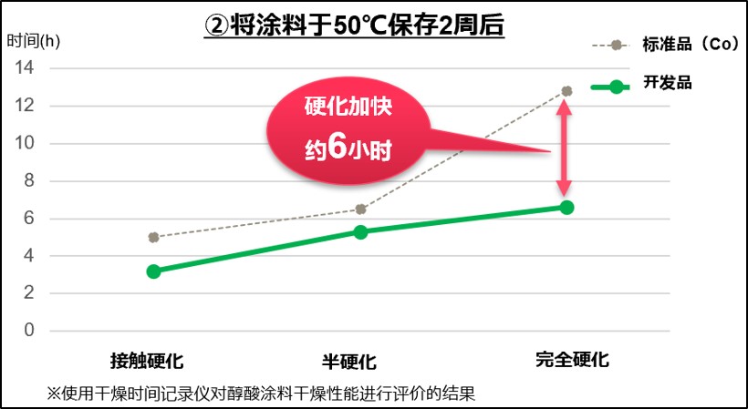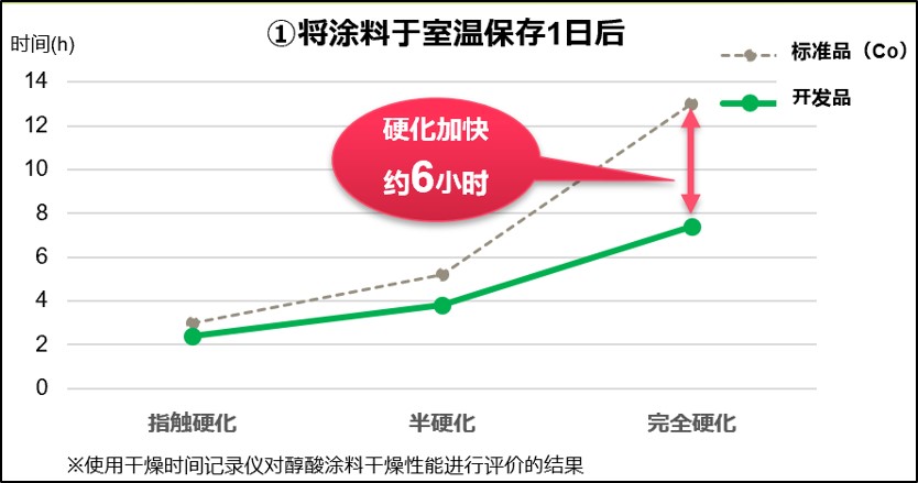 在促进涂料及印刷油墨固化及干燥过程中,会使用一种名为干燥剂的金属皂。金属皂通过金属盐类与脂肪酸的作用生成,其特性是不溶于水而溶于有机溶剂。此外,提高固化或干燥性能时,一般会使用钴(Co)这一金属盐,但钴会破坏环境且成本较高。为此,本公司开发出了这款拥有与钴干燥剂同等甚至更优速干性能的无钴干燥剂。该产品不仅可以发挥卓越的速干性能,还可在降低成本的同时减少对环境的破坏。此外,该产品不仅可以用于溶剂型,还可用于水性产品,能够满足客户不同的需求。