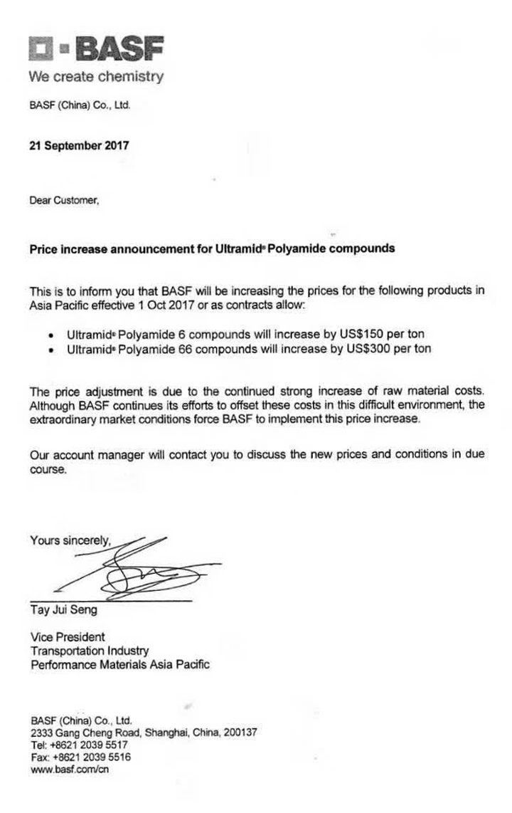 其实PA在近段时间已经在小幅上涨了,不少客户反映已收到厂家的涨价通知。究其原因,搜料网小编认为,PA上游己内酰胺持续走高是主因。本周,己内酰胺拉涨至662.5元/吨,涨幅达4.54%;PA6上涨266.67元/吨,涨幅1.52%。