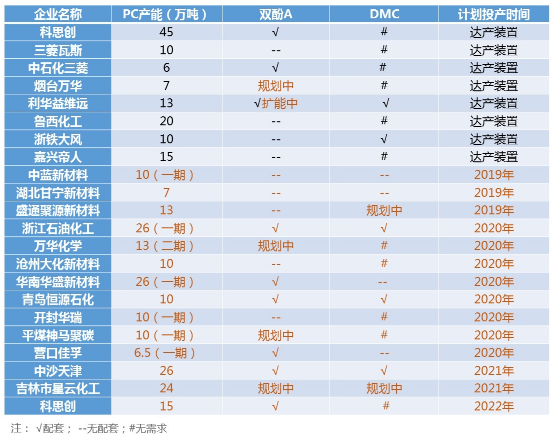 如上表所示,至2021年,我国将拥有科思创、中石化三菱、烟台万华、利华益维远、浙石化、华南华盛、平煤神马、营口佳孚、中沙天津、青岛恒源以及吉林星云化工高达11家产业链配套完善的聚碳酸酯生产工厂。