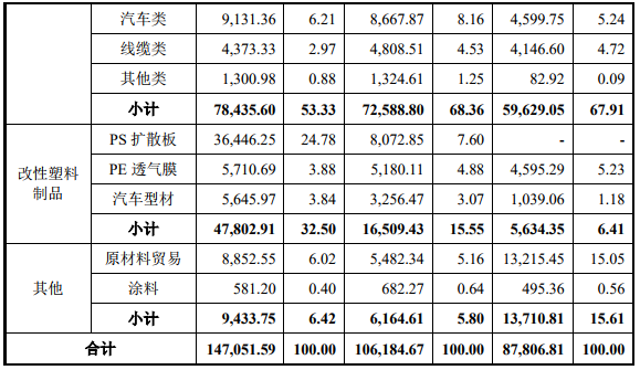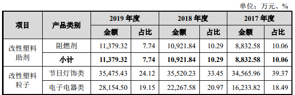 招股说明书披露,2019年,聚石化学改性塑料助剂、改性塑料粒子、改性塑料制品等产品的收入分别为1.14亿元、7.84亿元、4.78亿元,占比分别为7.74%、53.33%、32.50%。