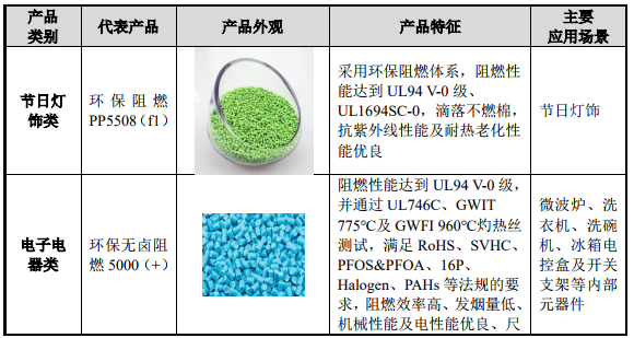 招股说明书显示,聚石化学的主要产品包括无卤阻燃剂、改性塑料粒子及制品。其中,无卤阻燃剂主要用于阻燃塑料和阻燃涂料的生产;改性塑料粒子及制品则广泛应用于节日灯饰、电子电器、电线电缆、汽车、液晶电视、医疗卫生等领域。