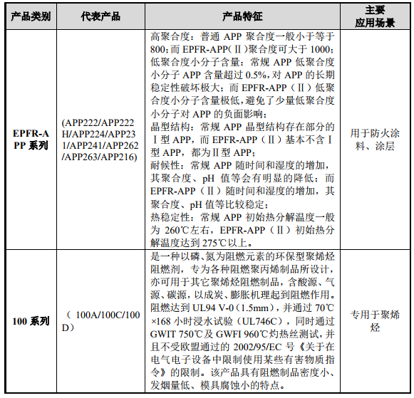 聚石化学生产的无卤阻燃剂热光稳定性好、环保性能优越,符合欧盟RoHS和WEEE标准。随着国家对环保的日益重视,无卤阻燃剂必将逐步替代现有的含卤阻燃剂成为新的发展趋势,并拥有更为广泛的市场前景。报告期内,公司生产的无卤阻燃剂主要产品如下: