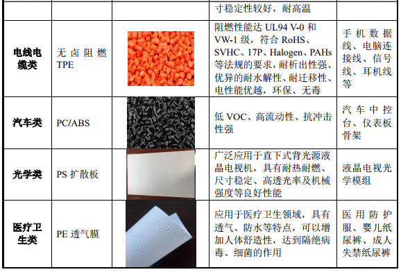 聚石化学自主研发的改性塑料产品广泛应用于节日灯饰、电子电器、电线电缆、汽车、液晶电视和医疗卫生等领域。报告期内,聚石化学生产的主要类型的改性塑料粒子及制品如下: