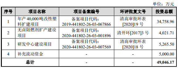 招股说明书显示,聚石化学主营业务为阻燃剂、改性塑料粒子及制品的研发、生产和销售。经过多年的创新和积累,已拥有包括无卤阻燃剂化学合成与复配应用技术、阻燃改性塑料制备技术、功能性高分子材料技术等多项核心技术。此次IPO,聚石化学拟投资4.90亿元用于年产40,000吨改性塑料扩建项目、无卤阻燃剂扩产建设项目、研发中心建设项目及补充流动资金。