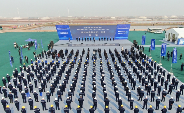 在开工仪式现场,山东海化集团党委书记、董事长、总经理孙令波介绍,为深入贯彻新发展理念,践行“双碳”战略,加快动能转换,海化集团规划实施了潍坊滨海风光储智慧能源示范基地项目。该项目依托海化集团制卤区,占地约38平方公里,装机容量3GW,计划投资140亿元,建设周期为2021—2025年,分四期建成。届时,年可发电40亿千瓦时,生命周期贡献税收约72亿元,年可替代煤炭指标160万吨。此次参与国家大型风电光伏基地项目集中开工的是基地一期300MW光伏发电项目,由海化集团自主开发建设,占地约442.1公顷,投资13.9亿元, 2022年底前建成投用,年可发电3.78亿千瓦时。