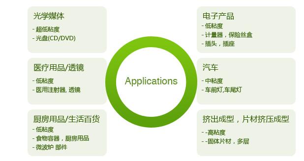 PC具有良好的机械性质、较高的热变形温度及固有透明度等,广泛用于光盘DVD、汽车前照灯、隔音墙及电气电子产品等。乐天化学引进日本AsahiKasei公司熔融工艺,生产聚碳酸酯PC。生产的PC与传统聚碳酸酯工艺不同,不使用有毒气体光气,不仅不排放废溶剂和废水,还把地球温暖化的元凶二氧化碳作为原料使用,且循环使用所有中间产物。广泛用于光盘DVD、汽车前照灯、隔音墙及电气电子产品等。