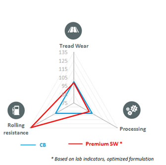 PremiumSW对比碳黑在货车轮胎销售市场的应用有着更强的市场前景。依据全新的检测結果看来,PremiumSW可以在维持同样水准的胎面纹路磨坏的状况下减少30%之上的翻转摩擦阻力!