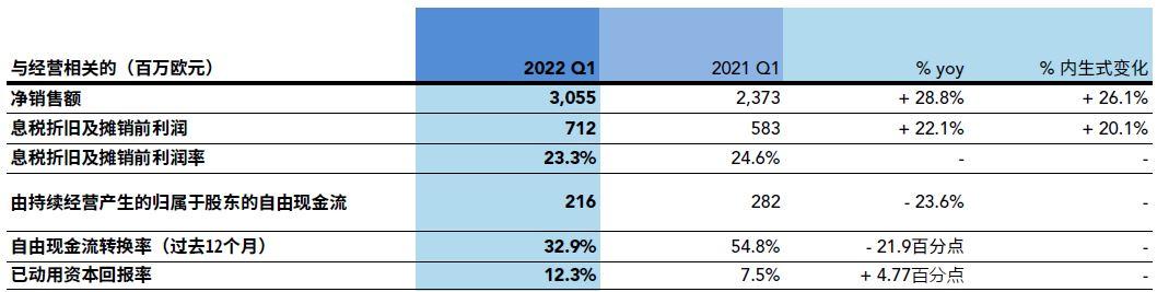 2022年第一季度公司基本息税折旧摊销前利润率为23.3%,与2021年全年水平相若,提价举措抵消了通胀带来的负面影响。