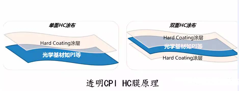 制备出的透明聚酰亚胺要想具备一定的耐刮性能,就需要在基材上进行涂布加硬固化。但是硬度和绕折性两者之间的平衡是柔性发展的瓶颈。因为基材经过硬化处理后,在反复绕折下,硬化层可能会出现龟裂,造成屏幕硬度降低影响外观效果。所以目前表面硬化和柔性的平衡是柔性屏发展突破的关键。据了解,目前三星的透明CPI膜涂布加硬合作企业为住友。