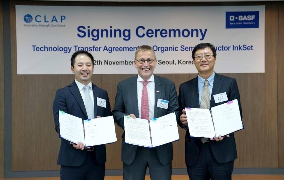 早前,韩国显示配件及传感器行业的领先企业 CLAP与全球化工公司巴斯夫 (BASF) 在韩国首尔签订 Organic Semiconductor InkSet 技术转让合同。