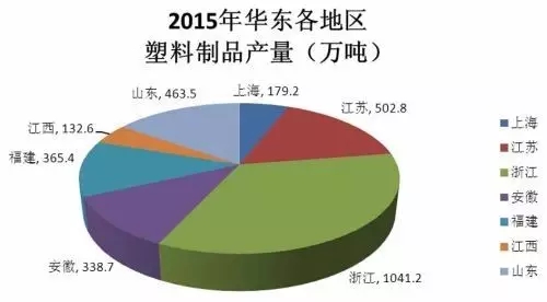 2015年华东地区各地区塑料制品生产量(万吨级)。