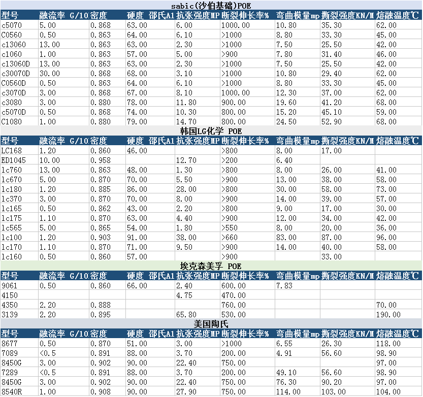 五、断裂伸长率:沙伯基础poe牌号平均值最高。