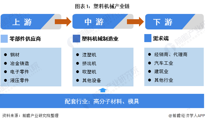 已有人阅读此文 - -塑料机械是塑料加工工业中所用的各类机械和装置的总称,其是随着高分子化学和塑料加工工艺的发展而发展起来的,并逐步成为一个独立的工业部门。塑料机械行业涉及的相关产业较多,其上游行业包括钢材、冶金铸造等机械类零部件生产加工行业,也包括液压零件、电子仪器仪表、电子元器件等传动类和控制类零部件生产加工行业,此外还包括高分子材料、模具等配套工业。下游为需求端,主要包括建筑、汽车、家用电器、3C产品等行业。