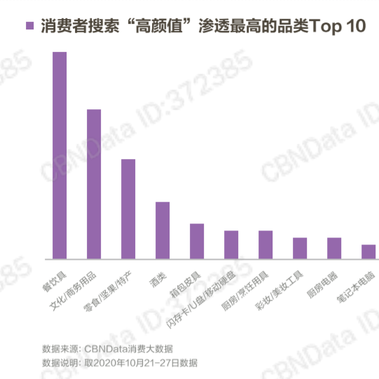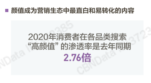 根据第一财经CBNDATA年度网购报告显示,消费者对于产品颜值的需求正在急速上升。2020整年度消费者在各个品类搜索“高颜值”标签的渗透率是2019同期的2.76倍。