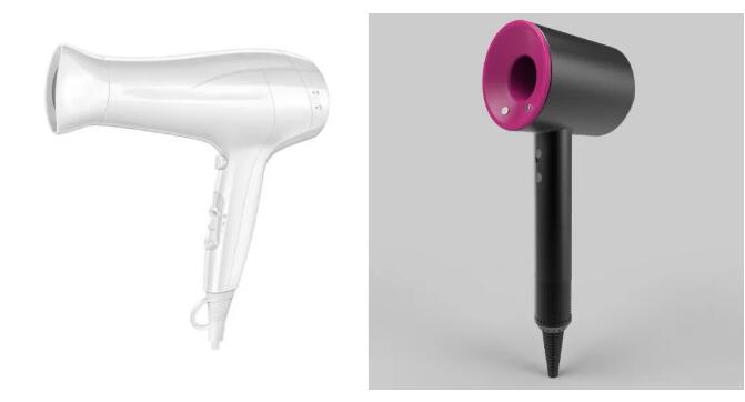 下图左侧就是传统的有页式吹风机,如大象鼻子拖着长长的吹风筒。作为区隔,戴森不仅别出心裁地采用了无页环形设计,纹理上也采用了更时尚的黑色金属纹理,尤其是那一抹亮艳的紫红色,浓浓的“黑科技感”扑面而来。