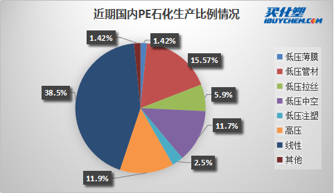 聚乙烯方面,目前国内主要PE生产企业合计产能共计1760万吨左右。其中生产线性产能占比约为38.5%,低压管材生产占比15.57%,高压生产占比11.9%,低压中空生产占比11.7%。除检修外,全国PE石化企业整体开工约90%。