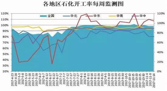 按通常年份,从9月份开始,直到次年3月份,塑料市场因农膜生产而逐渐进入采购旺季。其中,11、12月份为旺季中的小淡季。今年四季度,多了一项环保限产,规模以上塑料加工企业限产50%。这将导致下游需求不及从前,也表现在石化开工率小幅下滑,以及库存方面的上涨。