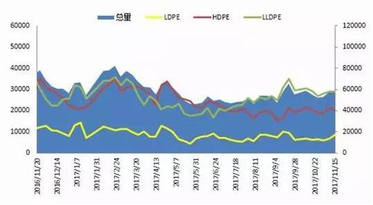 从装置运行看,11月份,石化装置检修较少。装置开工率较高使得供给较为充足。另外,市场预计,10月份进口PE的到港量偏大。这加剧了国内PE供给过剩的看法,亦导致库存的增加。装置开工率方面,本周聚乙烯装置开工率在94%左右,与上周基本持平。从区域看,开工率相对变化不大,华东地区处在超负荷状态。可见,环保检查对大石化厂影响不大。
