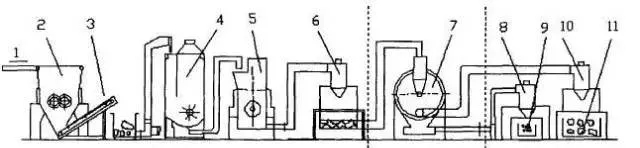 1.加料;2.粗破碎机;3.输送机;4.干燥粗洗净机;5.破碎机;6.除尘器;7.清洗机;8.除尘器;9.砂土泥等污垢;10.旋风分离器;11.干净破片