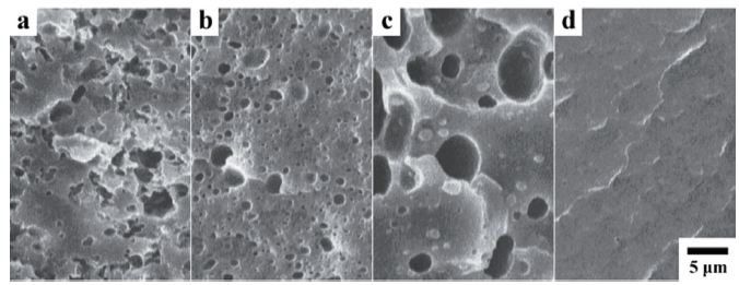 弹性体在PA6基材中的分散相规格会危害复合型产品的冲击性抗压强度,未改性的弹性体分散相规格很大;添加马来酸酐接枝物,分散相规格减少。