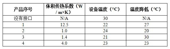 表2突出了需要考虑这些要求。通过测量使用中的发热装置的温度,比较散热的潜在差异。这些结果是基于一名终端用户的工作得出的,其所有产品都是热界面材料,使用相同厚度,使用相同的方法。