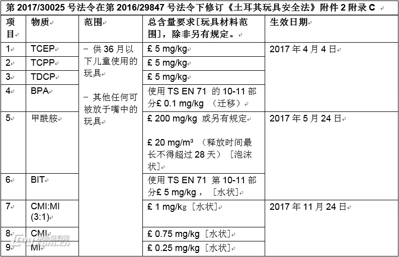 第2017/30025号权利法案对《土耳其玩具安全法》配件2附则C修订的关键汇总于表1中。