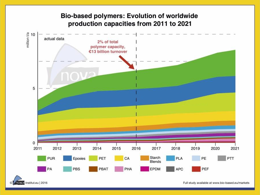 Nova-Institute预估全球生物基聚合物的产能将从2016年的660万吨级提高到2021年的850万吨级。