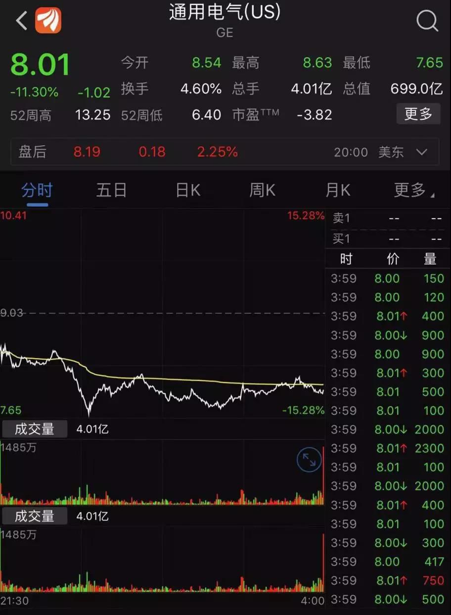 受此影响,通用电气股价周四开盘便大跌,盘中一度跌超15%,最终收跌11.3%,创11年单日最大跌幅。市值一天蒸发89亿美元,折合人民币626亿元。