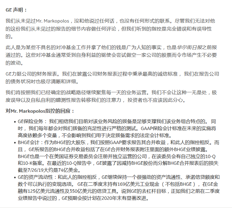 对于这份报告,通用电气也立即进行了针锋相对的回击,称马科波洛斯指控虚假,调查报告漏洞百出。并表示,此举只是市场操纵。