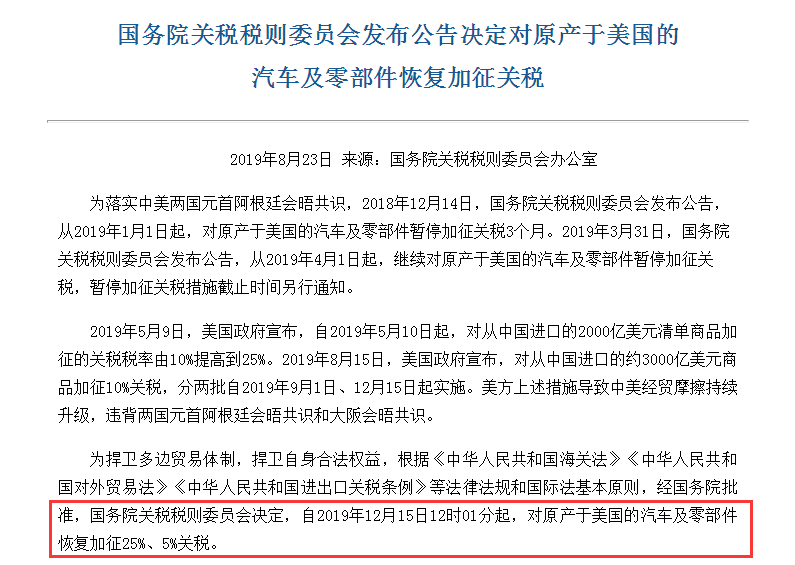 2.自2019年12月15日12时01分起,对原产于美国的汽车及零部件恢复加征25%、5%关税。