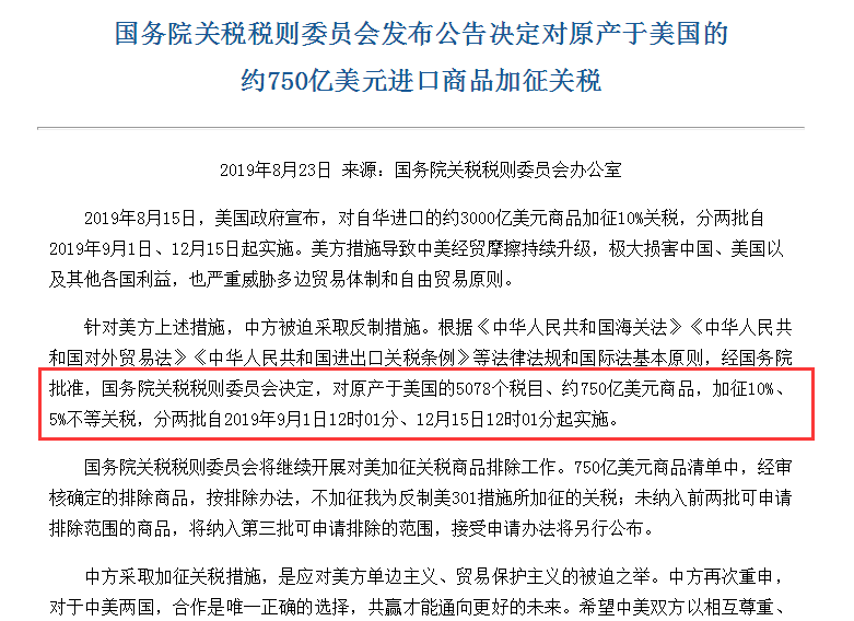 北京时间8月23日(周五)国务院关税税则委员会宣布: