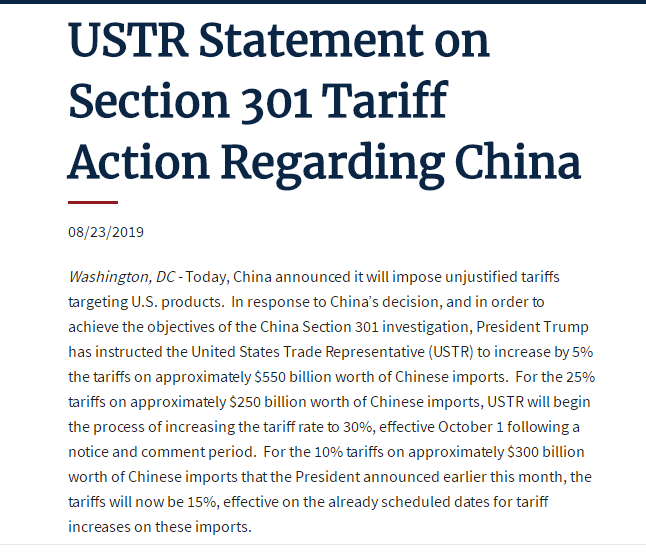 而在北京时间8月24日5点,特朗普发布推,对中国加征关税开始具体回应:对此前已经加征25%的2500亿美元的中国商品税率提高到30%,对剩余3000亿美元价值的中国商品,加征关税税率从10%提高到15%。分别于10月1号和9月1号起实施。