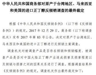 12月28日,商务部发布第100号公告,对原产于台湾地区、马来西亚和美国的进口正丁醇反倾销调查公布最终裁定。