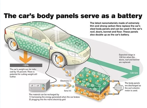 为了开发能像电池一样储存和释放能源的复合材料车身板,由英国帝国学院(英国伦敦)和沃尔沃轿车公司(瑞典哥德堡)领导、受欧盟资助的STORAGE项目(2010~2013),展示了采用超级电容器层压板制成的一种结构性超级电容器车顶和行李箱盖,与现有部件相比,它减轻了60%的重量。