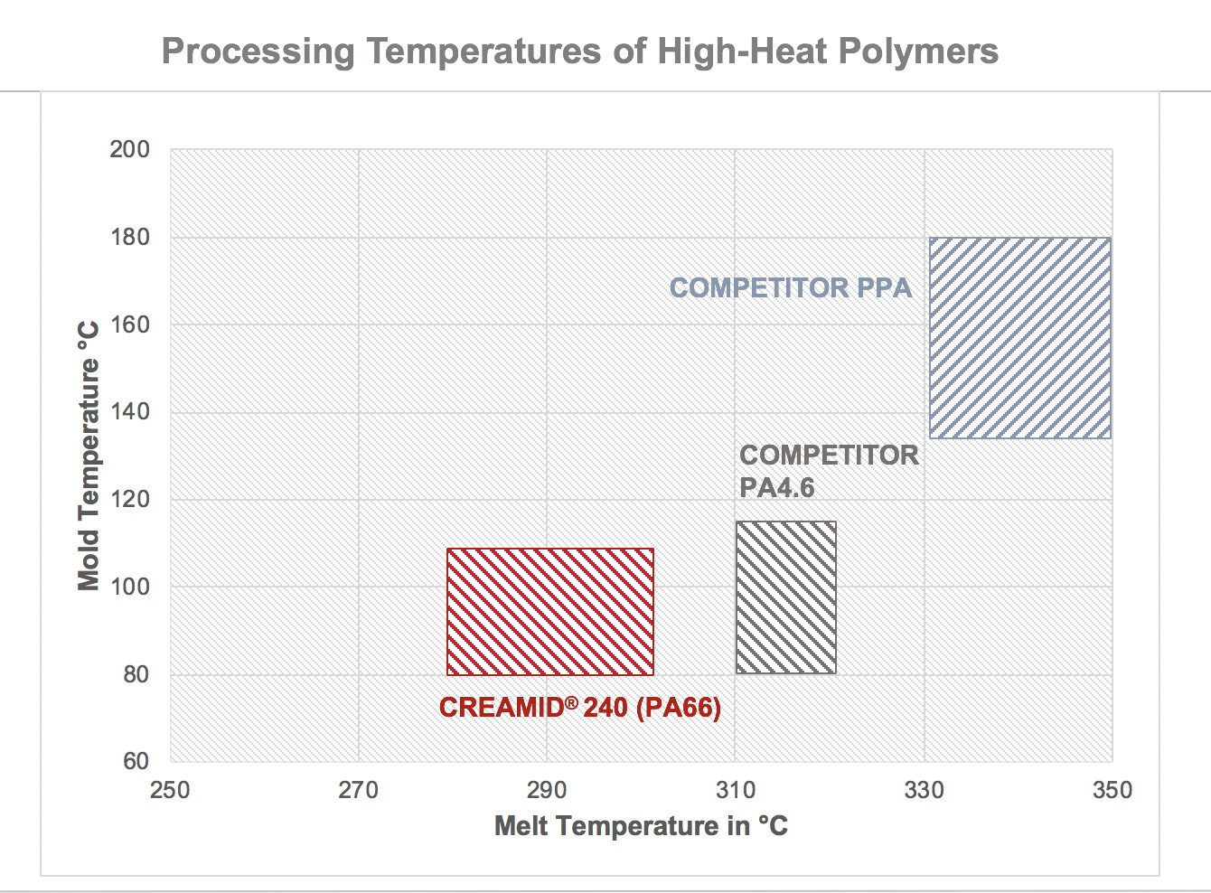 同时,这些新型化合物的加工温度范围介于 280°C 至 300°C 之间,模具温度范围介于 80°C 至 110°C 之间,而 PPA 或 PA 4.6 的相应范围分别为 330°C 至 350°C 之间和 130°C 至150°C 之间(见图)。