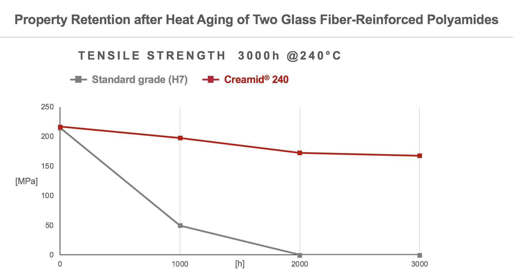 Creamid® 240 H7.5 系列化合物可提供高玻纤填充工程聚合物的强度和硬度,且即使在 240°C 的温度下持续使用,仍能保持较高水平的关键机械特性。目前,该系列化合物提供玻纤含量分别为 35%、50% 或 60% 的多种级别,与类似的玻纤填充标准 PA 66 化合物相比,其性能保持能力显著提高许多(见图)。同时,它们的每千克成本约比聚苯二甲酰胺 (PPA) 或 PA 4.6 等高性能聚合物低 30%,同时还能提供不相上下的性能。