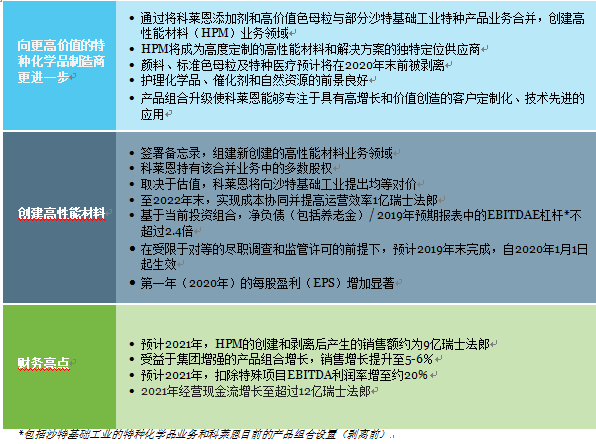 科莱恩将在计划合并的业务中持有多数股权。双方将在未来数月决定确定的估值,并以此为基础,由科莱恩向沙特基础工业提出均等对价。但这将不会导致科莱恩2019年末预期报表中的净负债(包括养老金)/ EBITDA杠杆率超过2.4倍(包括沙特基础工业特种产品业务,但基于剥离前的科莱恩当前产品组合体系),也不会对当前投资等级评定产生影响。在未来数月,科莱恩和沙特基础工业将就相关业务进行分割,进行对等的尽职调查,并继续商讨交易事宜,以期在2019年上半年签署最终协议。在监管许可的前提下,交易预计在2019年年底完成,2020年1月1日生效。