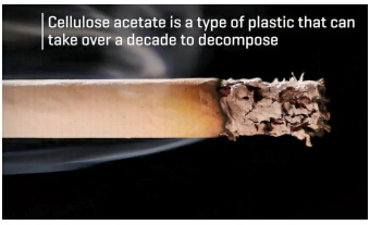 报道举例了某一香烟屁股污染项目,希望禁止使用醋酸纤维素(Cellulose Acetate)制成的香烟过滤嘴,醋酸纤维素是一种可能需要十多年才能分解的塑料。在每年生产使用此类过滤器的5.6万亿支卷烟中,其中近三分之二的卷烟被随意丢弃。事实上,自1986年以来,仅收集了6000多万个香烟屁股。