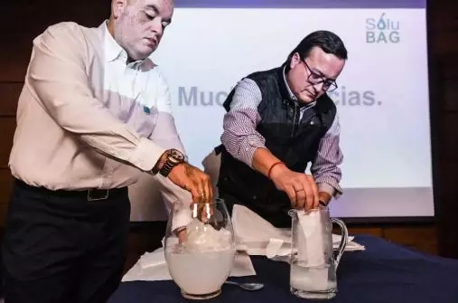 购物袋扔进水里能喝下去?这不是在开玩笑。在智利首都圣地亚哥,面对记者们的“长枪短炮”,智利SoluBag公司总经理罗贝托・阿斯泰特真没少喝溶进水里的购物袋。