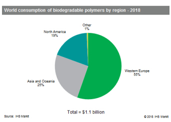 2018年全球生物可降解塑料的市场金额超过11亿美元,IHS Markit与此到2023年,全球生物可降解塑料的市场金额有望达到17亿美元。
