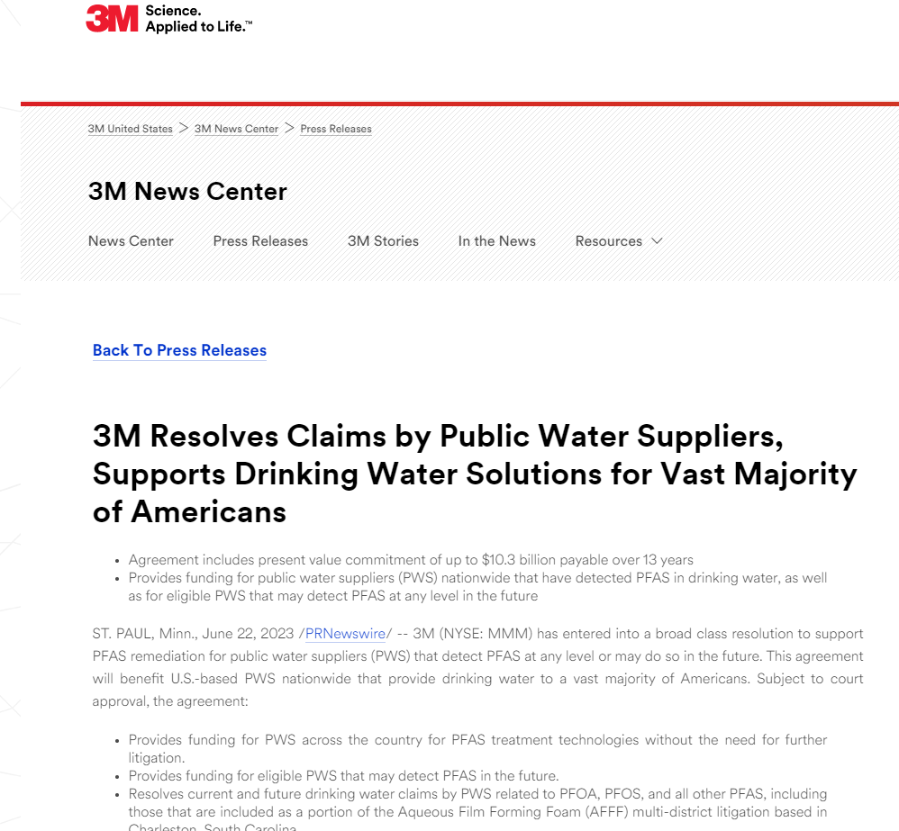 此外当地时间6月22日,美国3M公司(MMM.US)同意支付103亿美元,以解决数百起由多个城市提起的声称其饮用水被该公司制造的“永久性化学品”(PFAS)污染的诉讼。