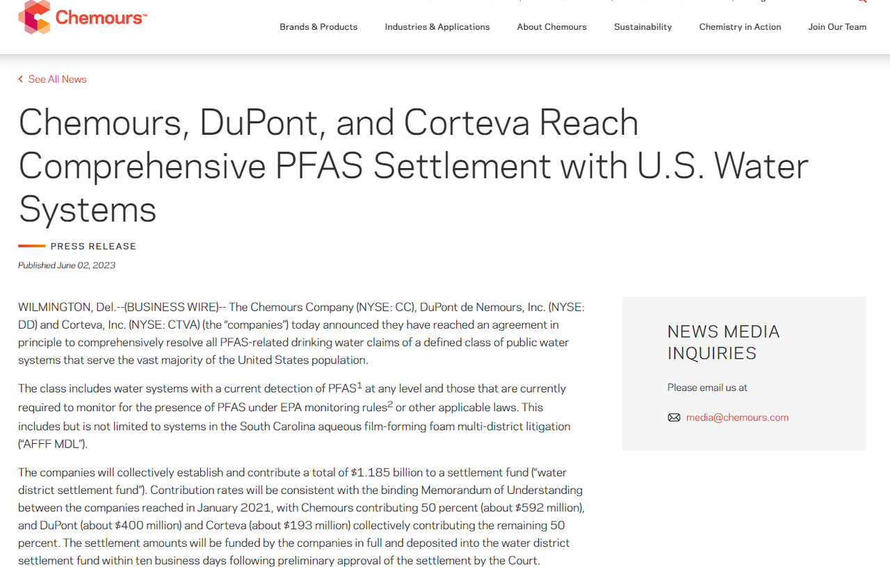 另外,三家主要的化学品公司——科慕公司、杜邦公司和Corteva公司在本月早些时候宣布,他们已就PFAS污染美国公共供水系统的指控达成了11.9亿美元的原则协议。和解基金将总共支付11.85亿美元,其中科慕支付5.92亿美元,杜邦支付4亿美元,Corteva支付1.93亿美元。