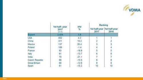 德国VDMA塑料塑料机械研究会称,德国塑料和硫化橡胶的机械加工制造生产商在2017上半年度出口增长量再创佳绩。德国出口总金额环比增长3.8%,做到了24亿欧元。
