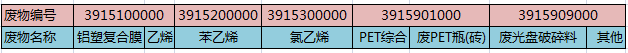 限定进口可作为原材料的固态废塑料有五个序号,每一个序号相匹配的废弃物名字为