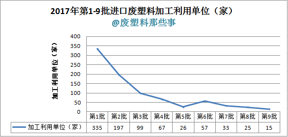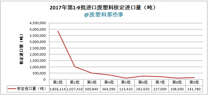 2017年4月21日,第9批废塑料进口批文公示公告,此次仅有15家公司得到了批文,核准进口量141,780吨。大家讨论一下环境保护部公示公告的2017年前9批所派发的废塑料进口批文数量数据图表。
