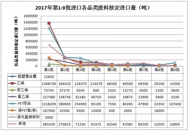 从折线统计图中能够 看得出,塑钢复合袋与废光碟粉碎料仅有第一批进口,这是由于第一批进口数量基础够全年度应用。每一个序号相匹配的废弃物核准进口量均呈递减发展趋势,在其中,丁二烯和PET综合性略微回暖。