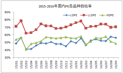 中国聚乙烯产量稳步增长,2016年PE各种类自给率环比2015年均处在提高趋势,在其中LLDPE自给率最大,截至9月份,LLDPE自给率71.79%,同比增长率2.57%;HDPE自给率51.98%,同比增长率0.28%;LDPE自给率50.98%,同比增长率4.89%。